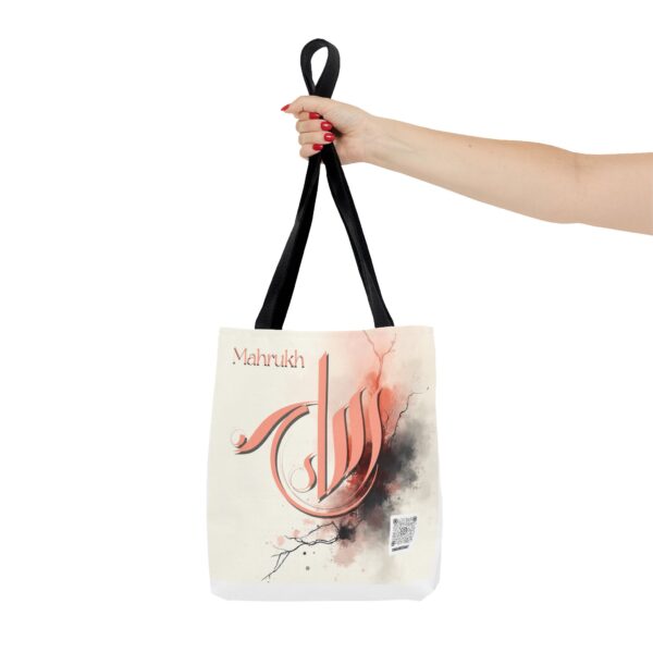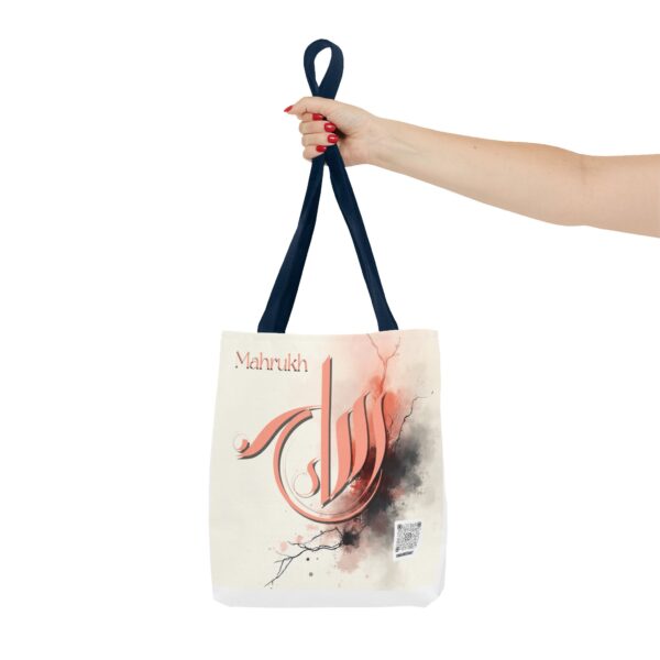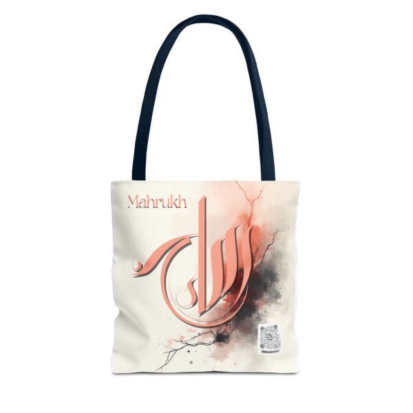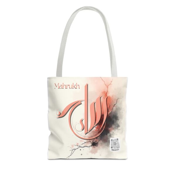 Mahrukh – Personalized Sumbli Arabic Calligraphy Tote Bag, embrace elegance and meaning with our Tote Bag — a fusion of Sumbuli Arabic calligraphy and modern design. The background watercolor art paired with the graceful calligraphic strokes creates a balance between culture and contemporary style.