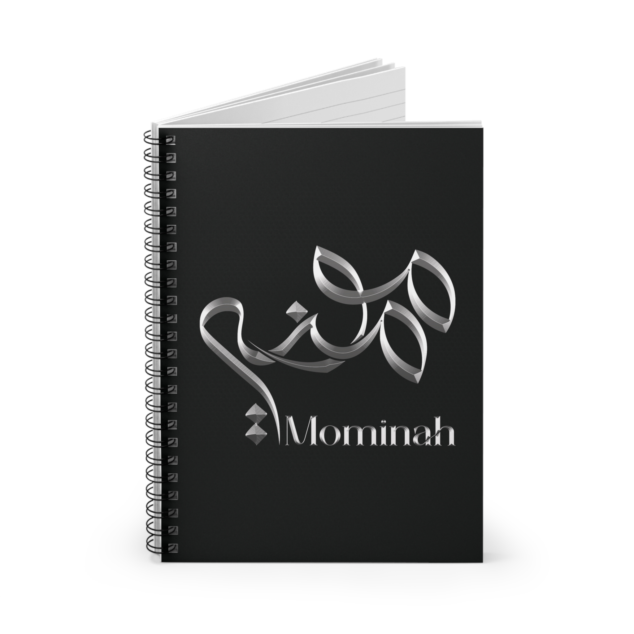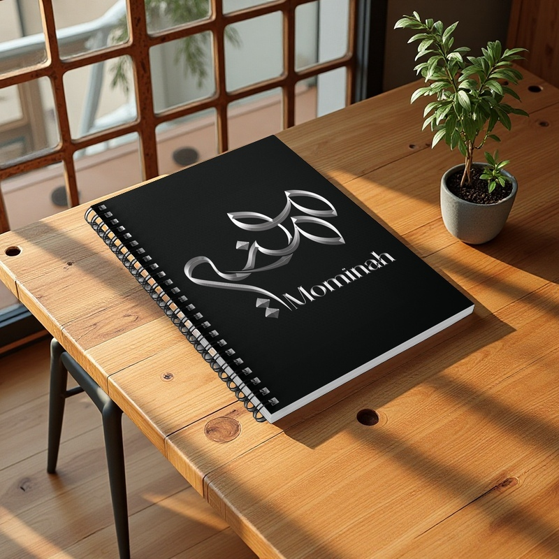 - Elegant Finish: The front cover features your personalized Arabic name in beautiful calligraphy, while the dark grey back cover and metal spiral binding add a touch of sophistication.
