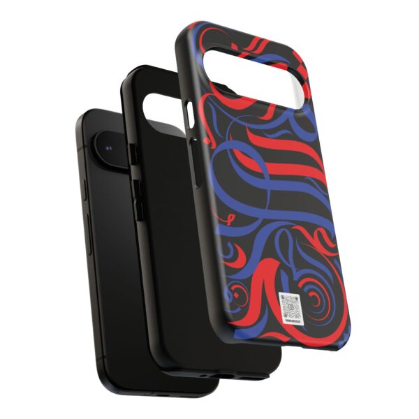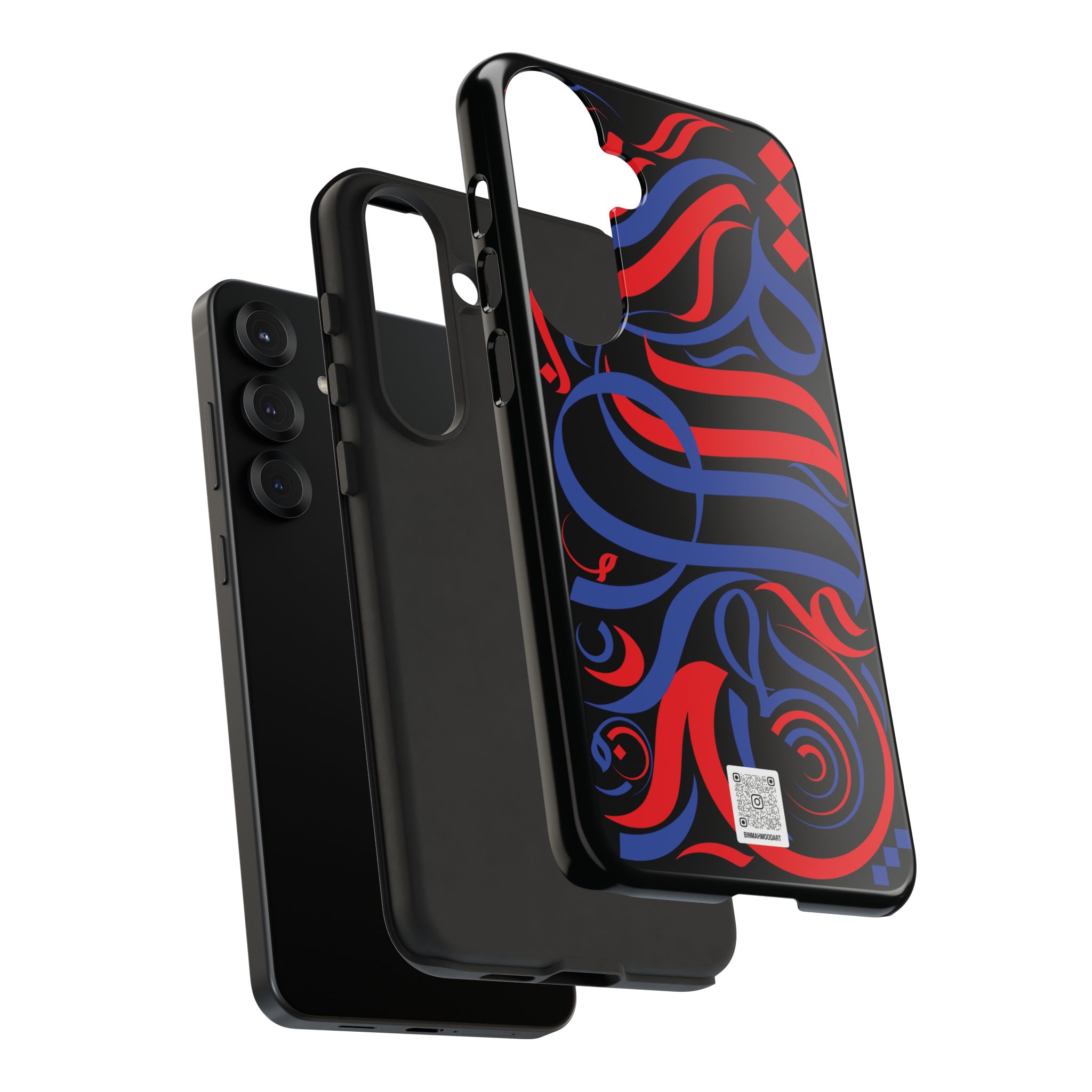 Experience a striking fusion of bold colors and artistry with this Personalized Blue & Red Stokes Sumbuli Arabic Calligraphy Phone Case by #binmahmood.