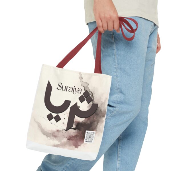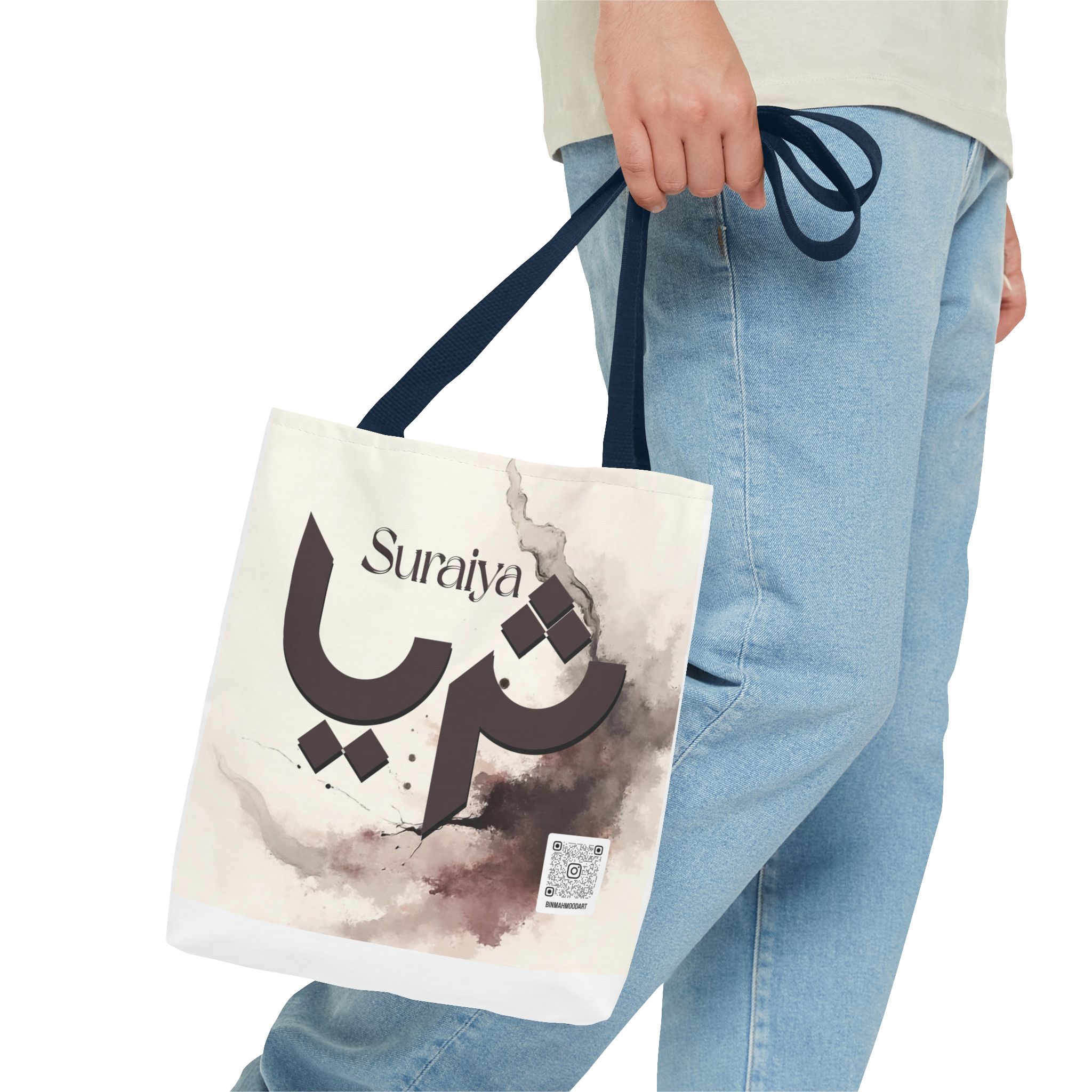 Suraiya – Personalized Arabic – Persian Fusion Calligraphy Tote Bag, embrace elegance and meaning with our Tote Bag — a fusion of Arabic-Persian calligraphy and modern design. The background watercolor art paired with the graceful calligraphic strokes creates a balance between culture and contemporary style.